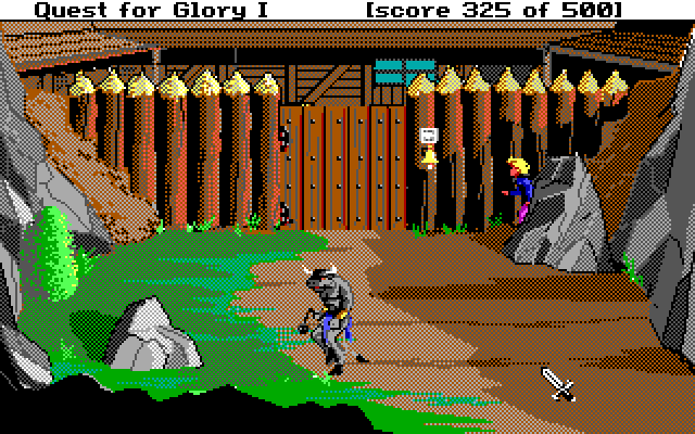 And that folks is how you get better in QFG. Your skills increase by using them, and the only thing that prevents you from using your skills are your stamina and health points which will slowly drain as you practice your various skills. Perseii throws a few more rocks before resuming his exploration, behind the town he finds: